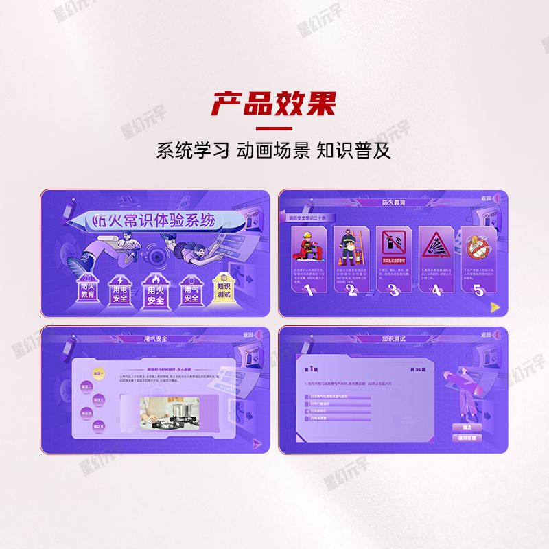 多场景适配技术:支持根据家庭、校园、企业、社区等不同场景的需求,定制化推送针对性学习内容。系统操作逻辑简洁,搭配清晰的引导提示,不同年龄段、不同群体均可快速上手,实现消防安全教育的广泛覆盖。