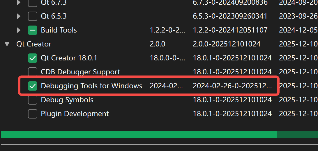 - 在Qt Creator下选中Debugging Tools for Windows。这个Qt针对Windows MSVC的调试工具,不安装这个代码没法调试。