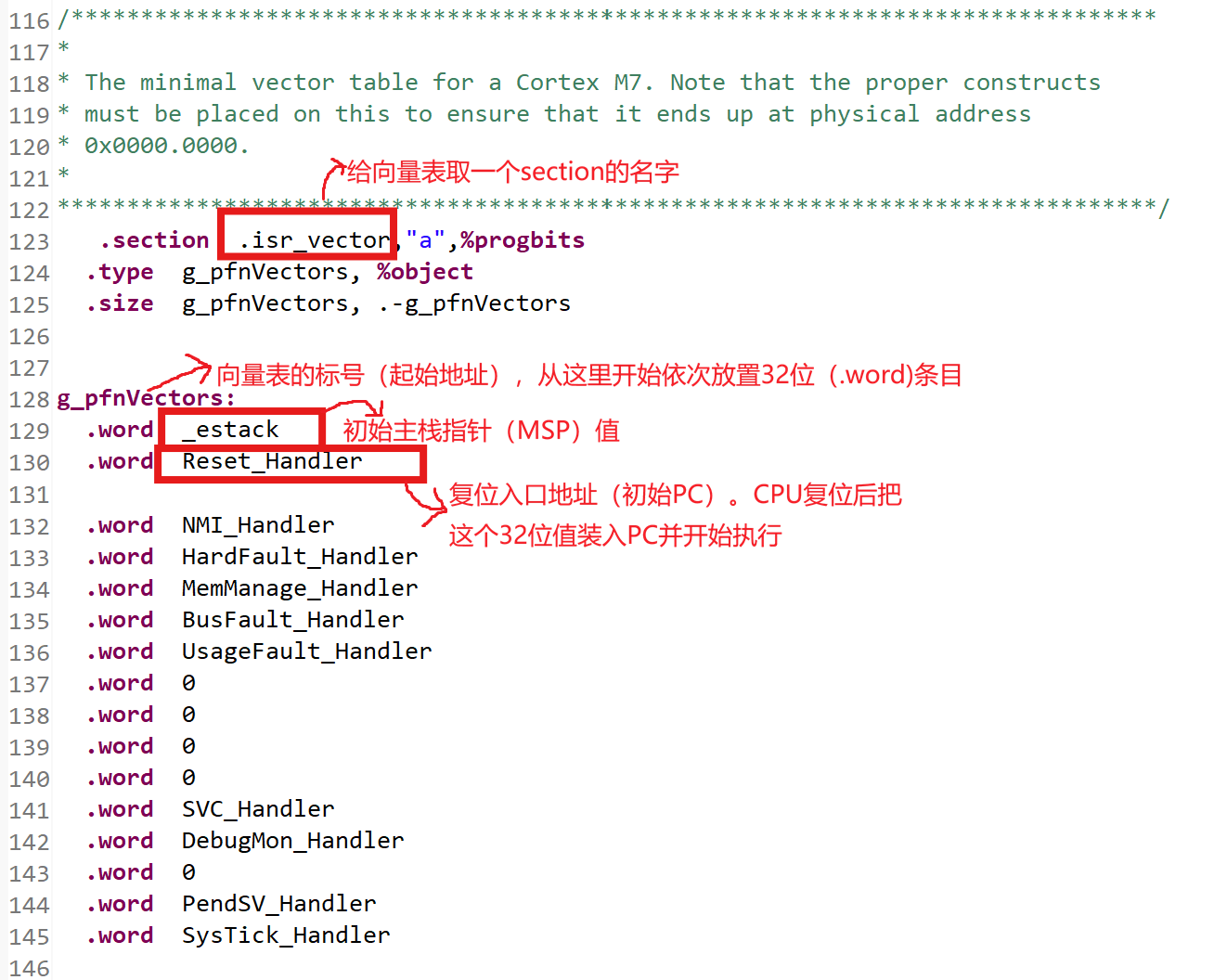 这是 Cortex-M 的中断/异常向量表(vector table),用来告诉处理器启动时的初始栈指针和各异常/中断的入口地址。