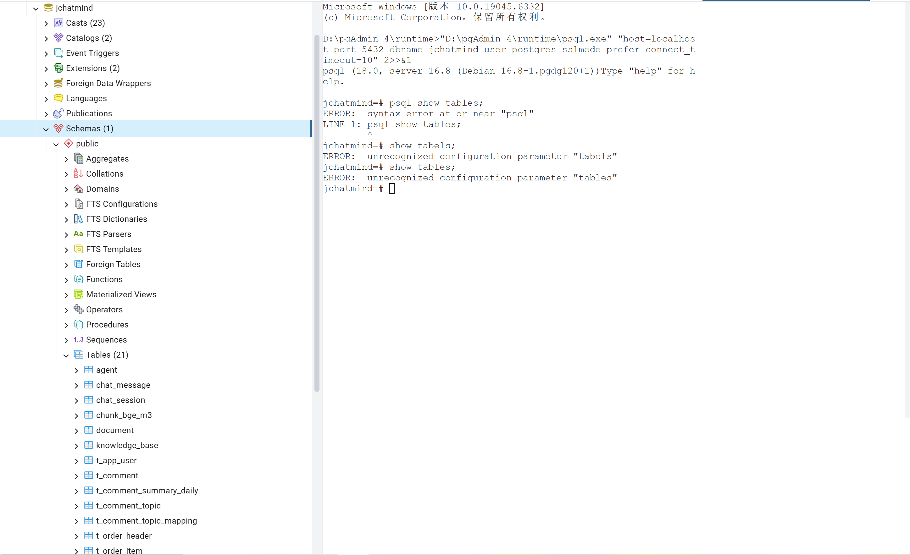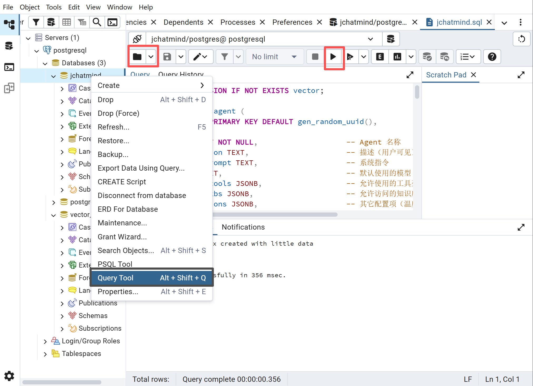建jchatmind数据库后,点击Query Tool,导入卡哥的sql文件并执行即可