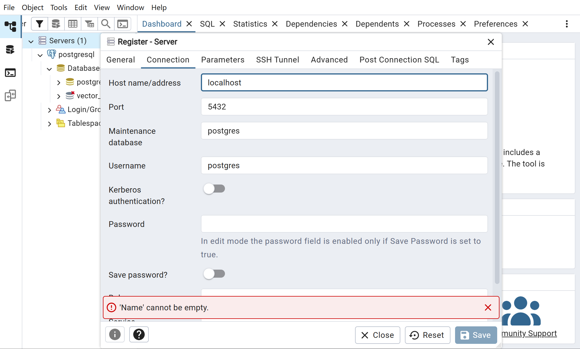 使用 PgAdmin连接数据库,配置如下,根据自己的配置自行修改