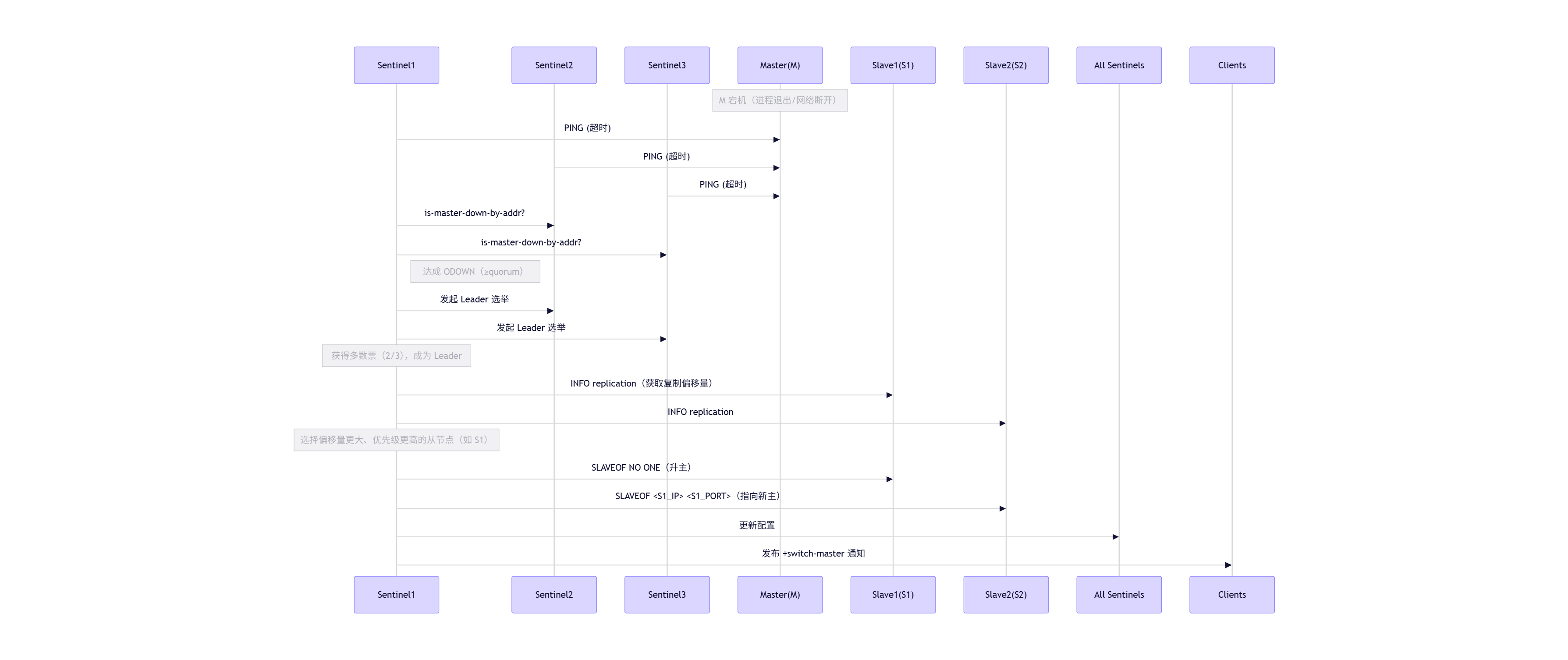 quorum(如 2 个)哨兵认为 M 宕机 → 触发故障转移- Sentinel 们先选举出一个 Leader(需多数派,3 个哨兵可容忍 1 个故障)