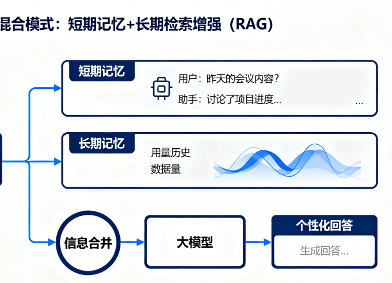 - 核心逻辑:用户提问时,先从短期记忆拿近期对话,再从向量库检索相关长期记忆,两者合并后传给大模型。