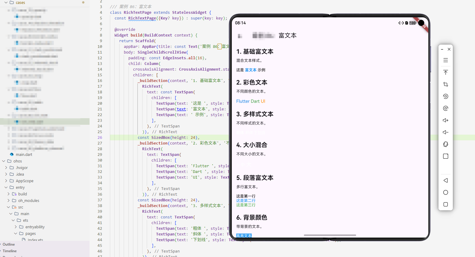 解释 :这个示例展示了RichText的基本用法。TextSpan是富文本的核心,通过children属性嵌套子TextSpan,可以实现不同样式的文本组合。在OpenHarmony上,我们需确保所有TextStyle属性都得到正确映射。
