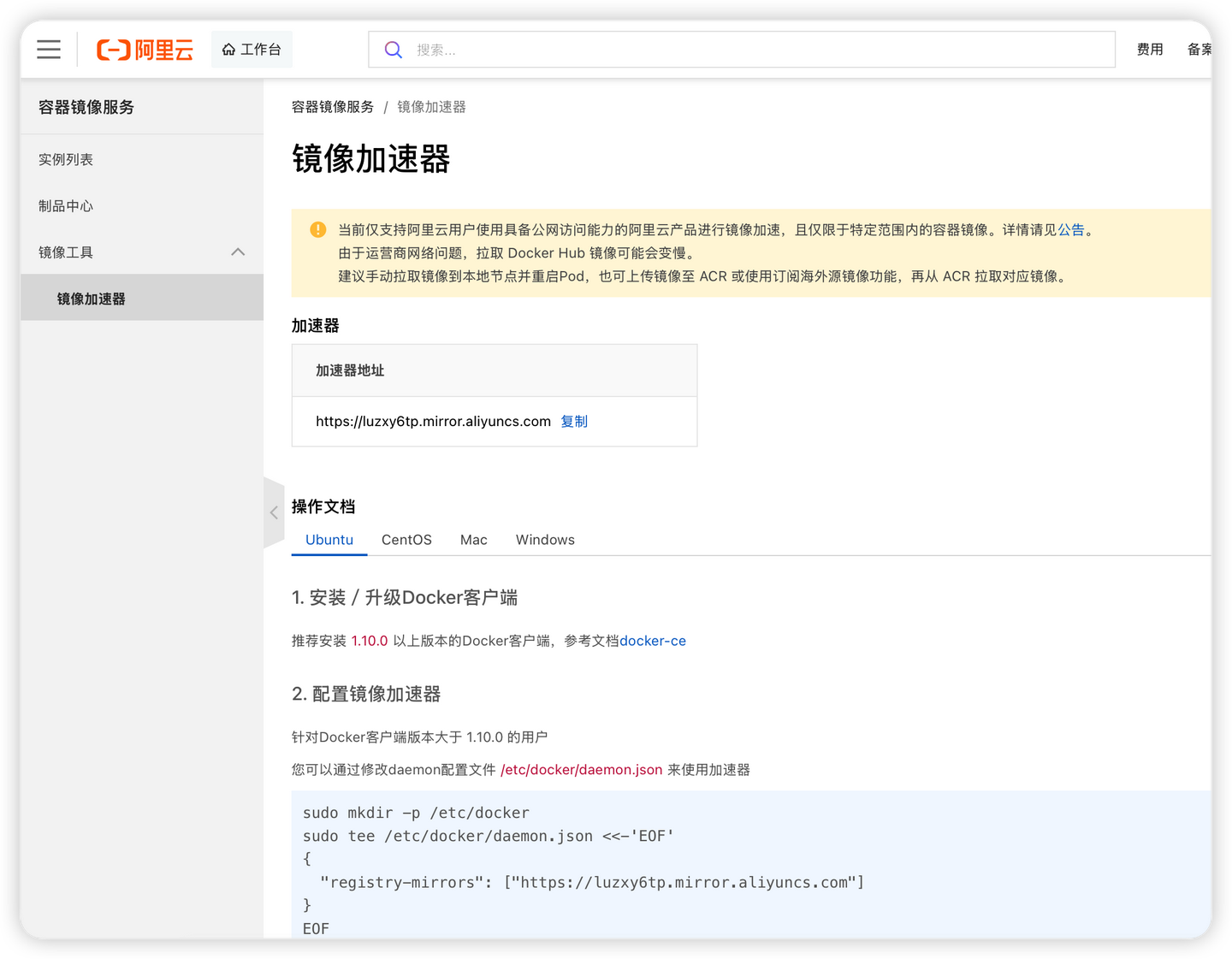 也可以自建Docker仓库镜像加速器,通过阿里云、华为云、腾讯云提供的镜像服务,创建加速服务