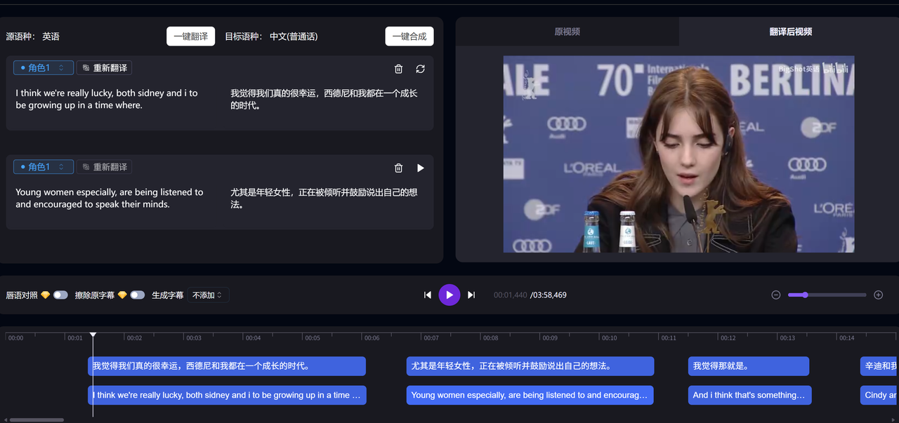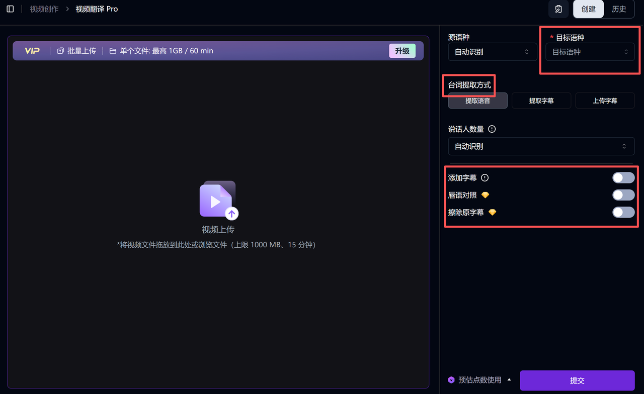 第二步: 选择源语言(英语)和目标语言(中文),并勾选需要的功能,比如字幕、去水印等。可以自行选择台词提取方式、唇语对照等功能。
