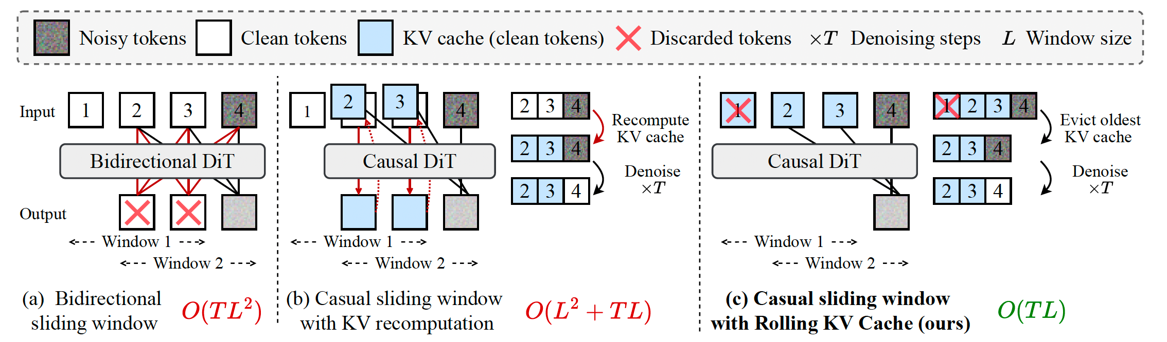 自回归模型相较于标准视频扩散模型的一个关键优势在于其外推能力,原则上可以通过滑动窗口推理生成无限长的视频。尽管使用 Diffusion Forcing 训练的双向注意力模型 [10, 73] 也能够以自回归方式生成视频,但它们不支持 KV 缓存,因此在生成每一个新帧时都需要完整地重新计算注意力矩阵。这会导致过高的计算复杂度 O ( T L 2 ) O(TL^2) O(TL2)(其中 T T T 表示去噪步数, L L L 表示窗口大小),如图 3(a) 所示。
