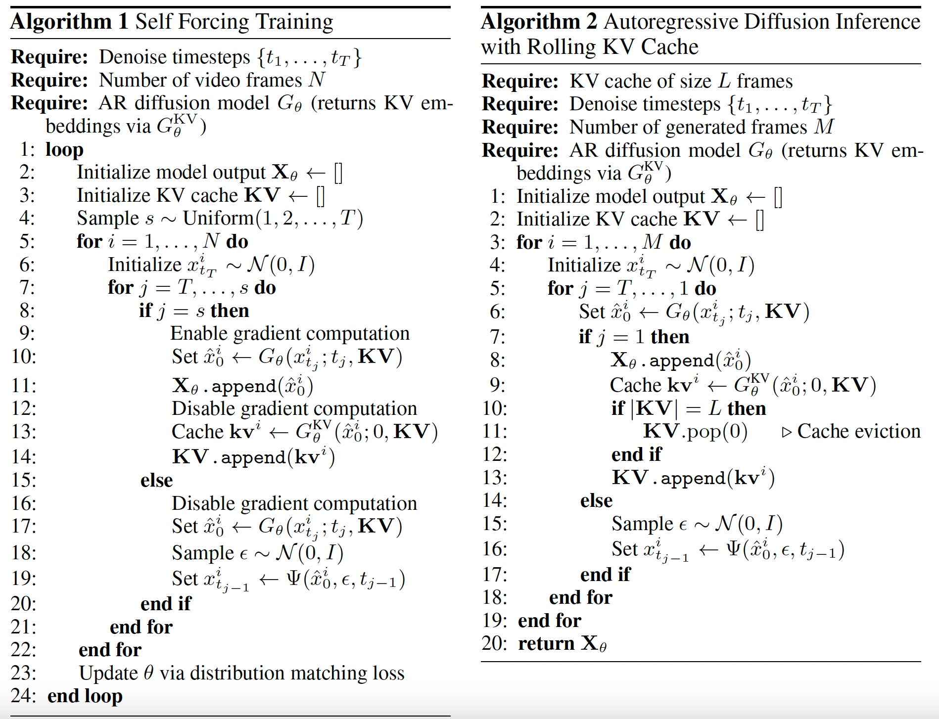 即便采用少步模型,若对整个自回归扩散过程进行朴素的反向传播,仍会导致过高的内存消耗。为此,我们提出了一种梯度截断策略,将反向传播限制在每一帧的最后一个去噪步骤上。此外,与推理阶段始终使用 T T T 个去噪步骤不同,我们在每次训练迭代中为每个样本序列从区间 [ 1 , T ] [1, T] [1,T] 中随机采样一个去噪步数 s s s,并将第 s s s 步的去噪结果作为最终输出。这种随机采样策略确保了所有中间去噪步骤都能够获得监督信号。我们还通过将梯度流限制在 KV 缓存嵌入中,在训练过程中切断来自先前帧到当前帧的梯度传播。关于完整训练流程的描述,请参见算法 1。