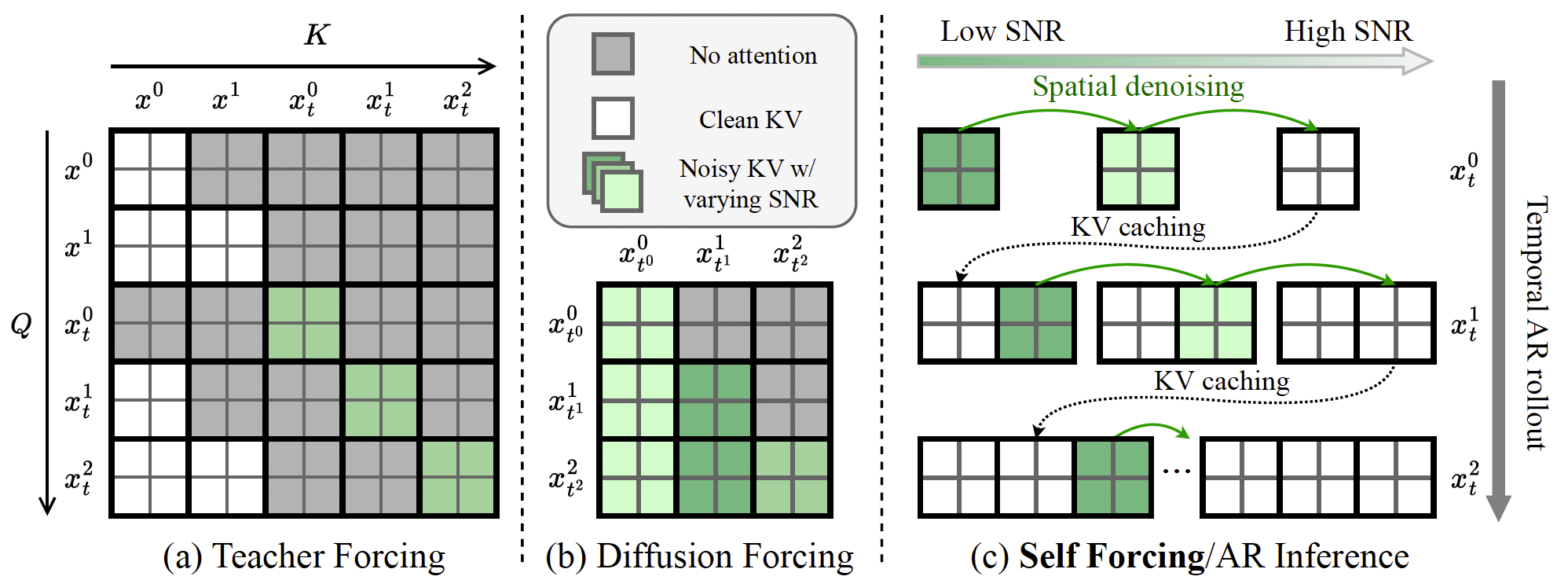 图 2:注意力掩码配置。Teacher Forcing(a)和 Diffusion Forcing(b)均在整个视频上并行训练模型,并通过定制的注意力掩码来强制因果依赖关系。相比之下,我们的 Self-Forcing 训练方式(c)通过使用 KV 缓存来复现自回归(AR)推理过程,而不依赖任何特殊的注意力掩码。为便于说明,我们展示了一个视频包含 3 帧、且每一帧由 2 个标记组成的示例场景。