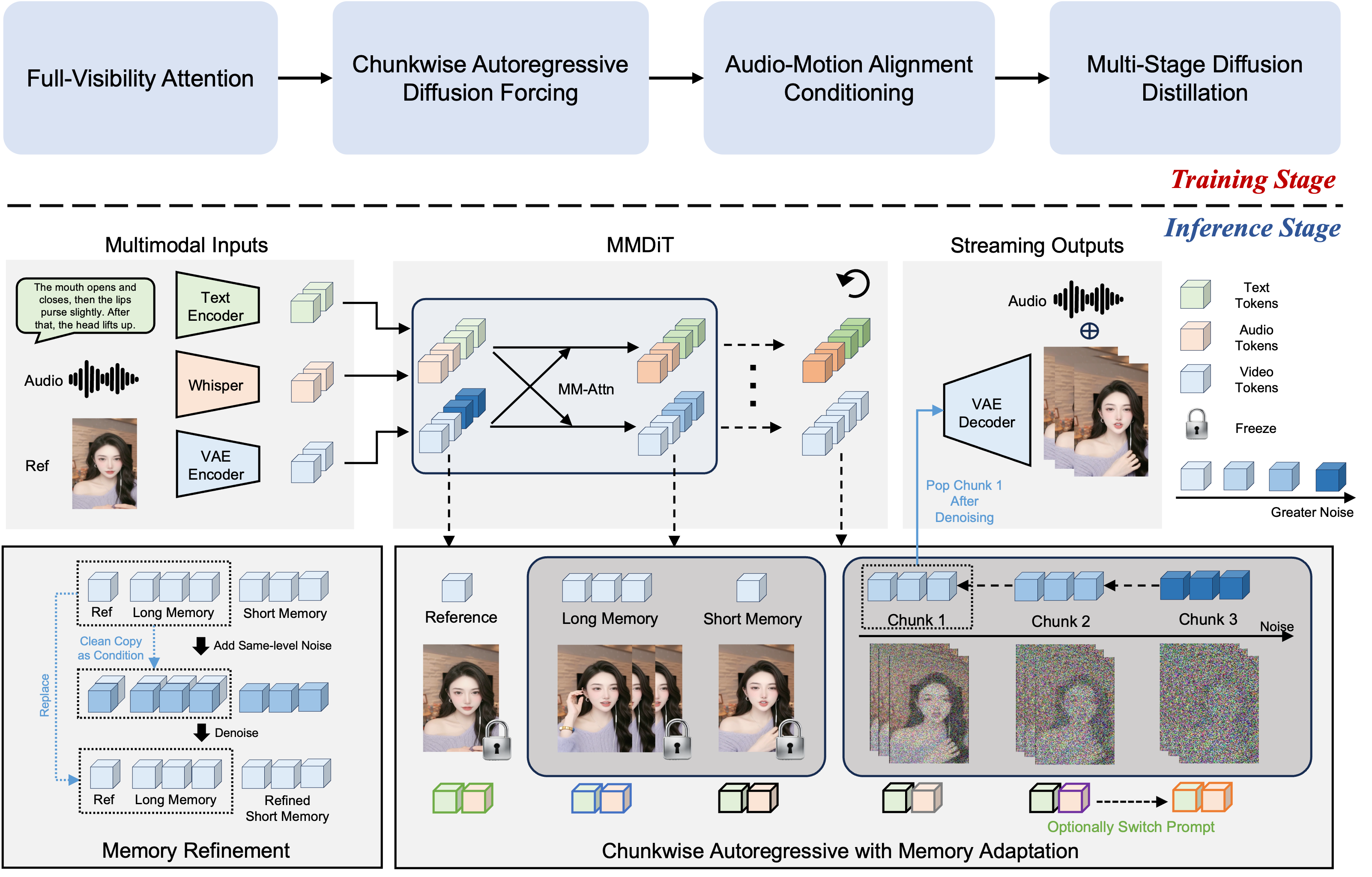 图2:FlowAct-R1 框架架构图。上半部分为训练阶段的三个关键组件:分块自回归适应、音频-动作对齐训练、多阶段蒸馏;下半部分为推理阶段的流式缓冲机制和记忆优化策略。