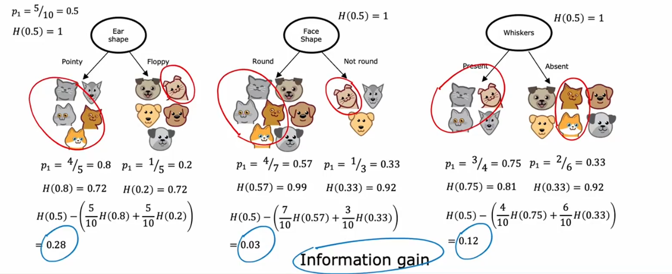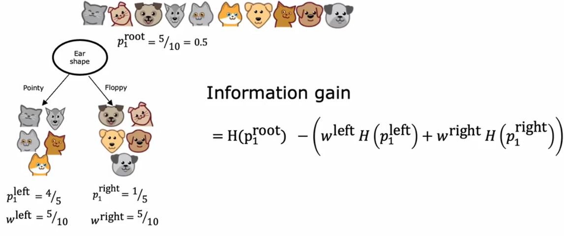 我们对集合做不同的决策分割,计算左右子树的熵值,进一步对其利用固定公式求加权平均,再利用根节点本身的熵值减去所得到的值,就是熵减量,也就是信息增益