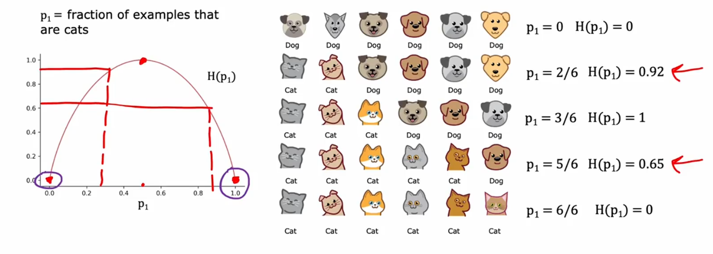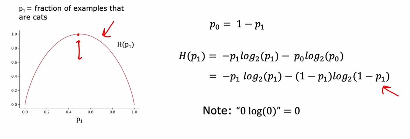 熵函数为H(p1),上图坐标图横轴为p1,纵轴为熵值,这里p1我们设置为集合中的猫所占整体的比例,以下是熵函数的表达