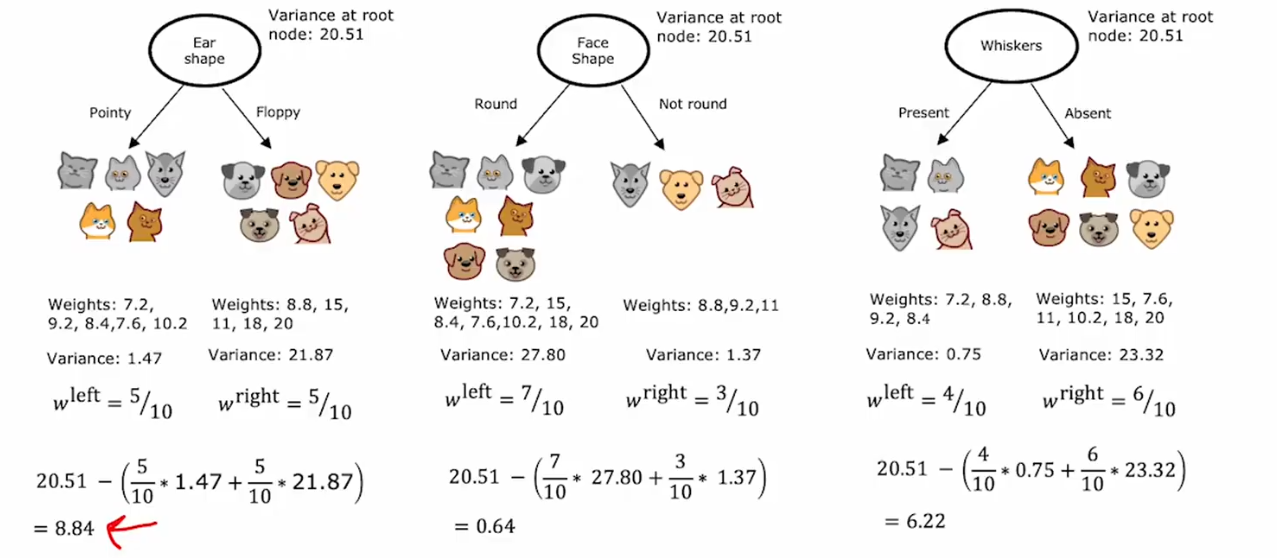 - 我们选择加权平均差减少最多的为最佳分割特征