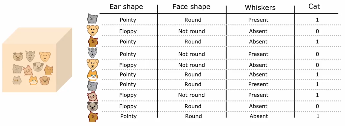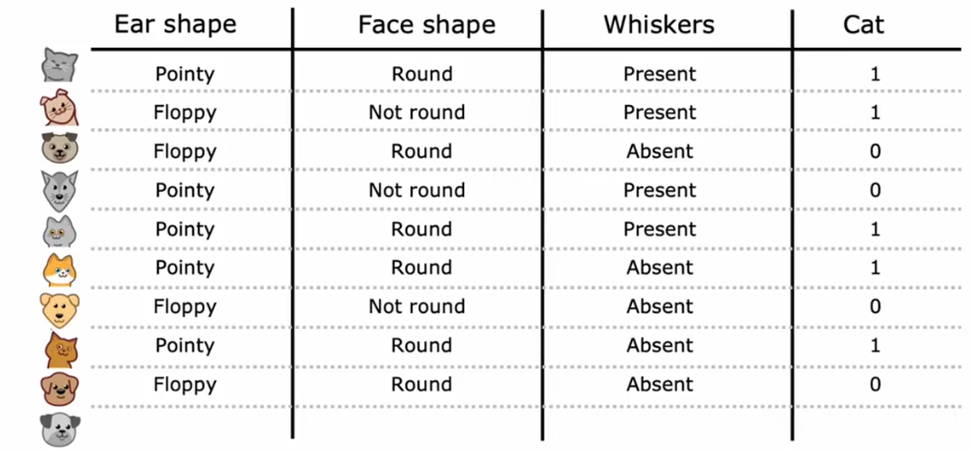 这里有一个数据集,通过耳朵,脸部,是否有胡须来判断是否是猫