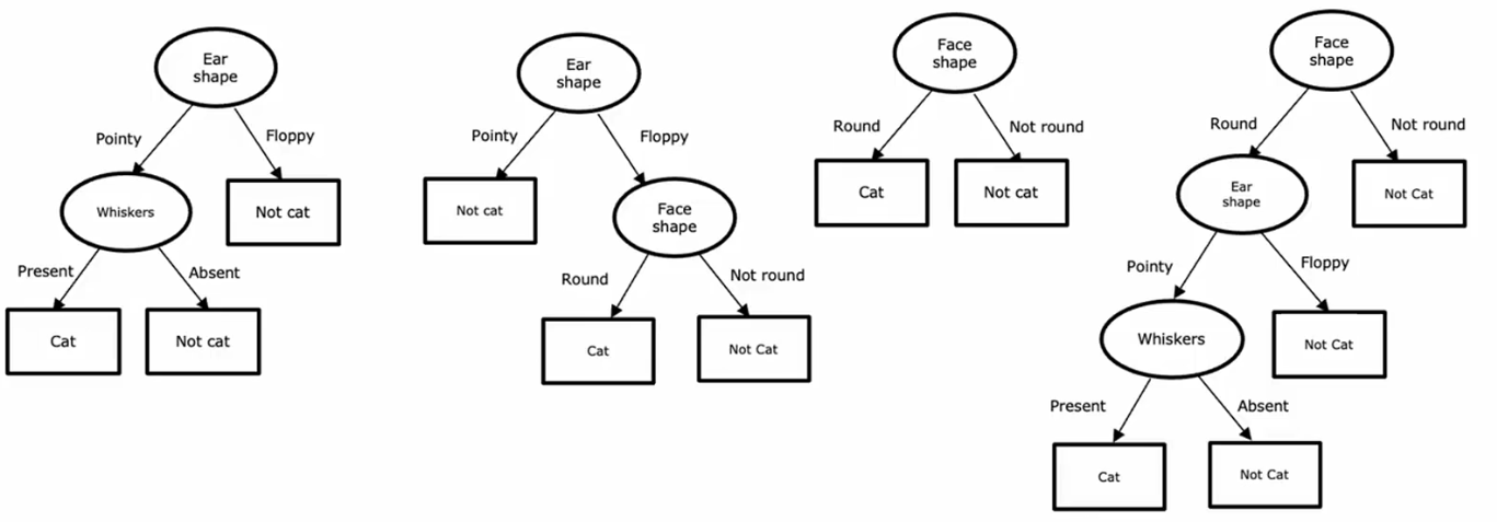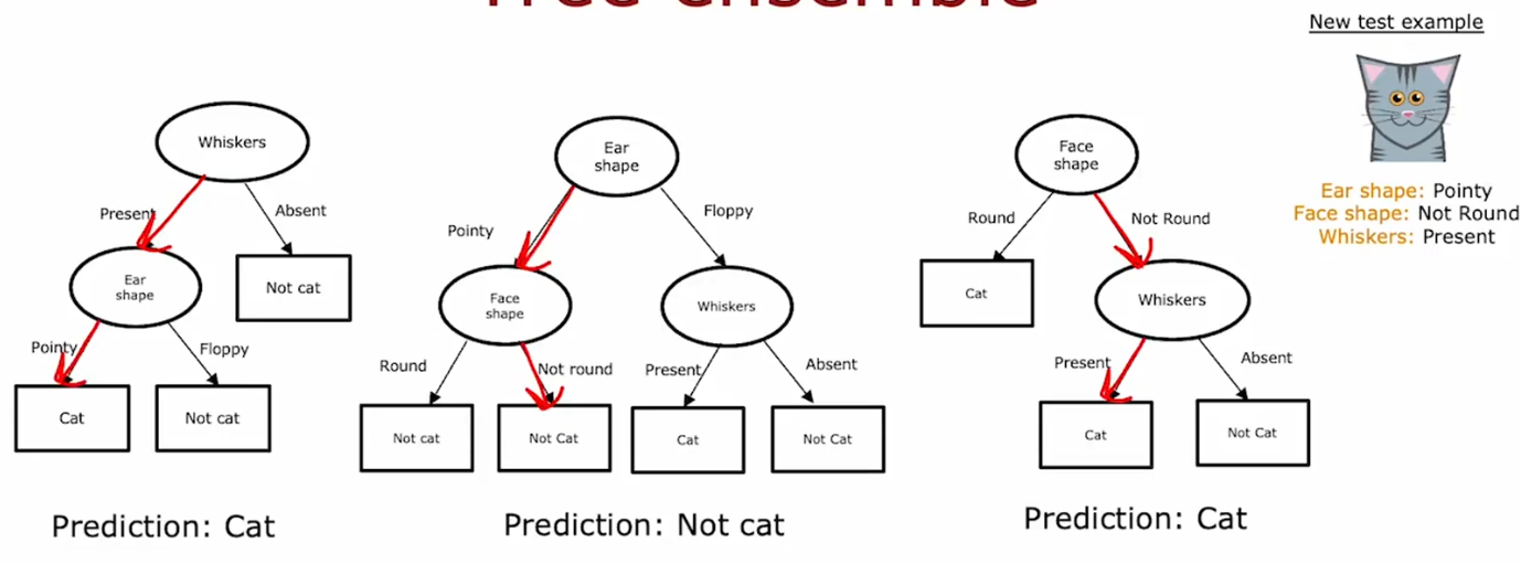 如图所示构建的三颗决策树,得到不同结果,让后让树进行投票,其中判断是猫的数目更多,所以最终结果就是猫