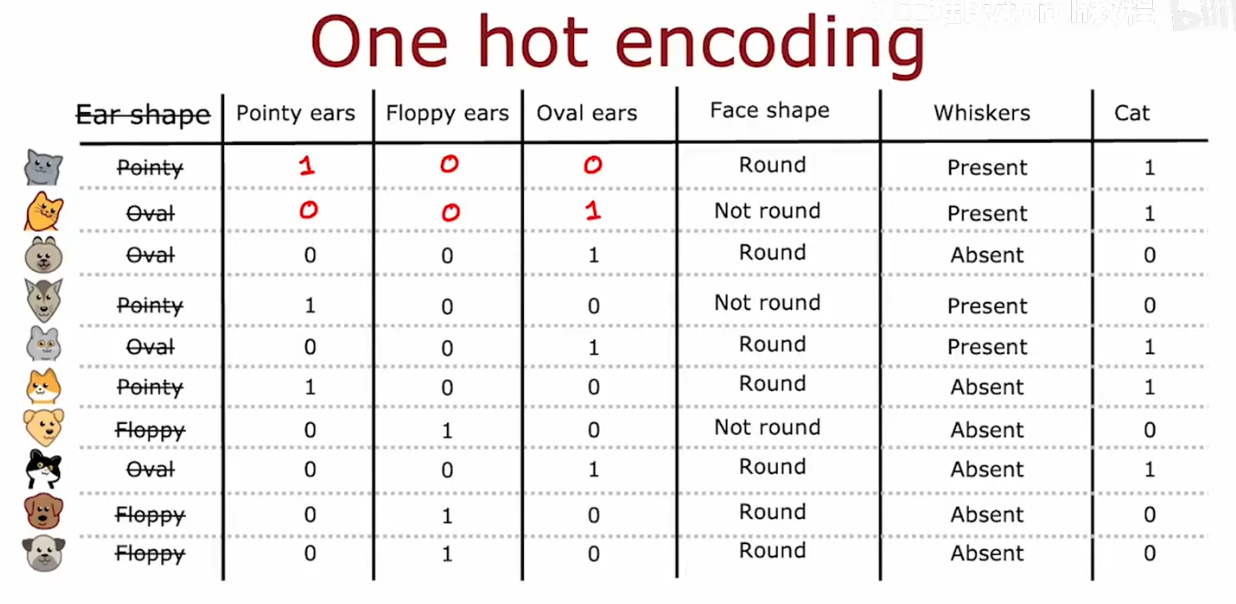 对于一个特征有多个取值情况,我们需要对这个特征的不同取值进行编码,1代表符合特征,0代表不符合,这样就能对"耳形"特征进行编码,这就是独热编码