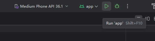 项目创建完成后,点击顶部工具栏的 "Run" 按钮(绿色三角形图标),或按快捷键 "Shift+F10",系统会启动内置模拟器。