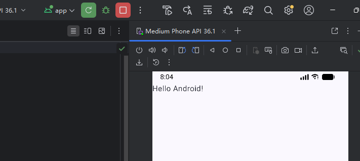 首次启动模拟器需等待一段时间,太慢可以点击下面进度条查看启动进度,模拟器启动后,会显示项目的默认界面(一个带 "Hello Android!" 文字的空白页面),至此第一个项目创建并运行成功。