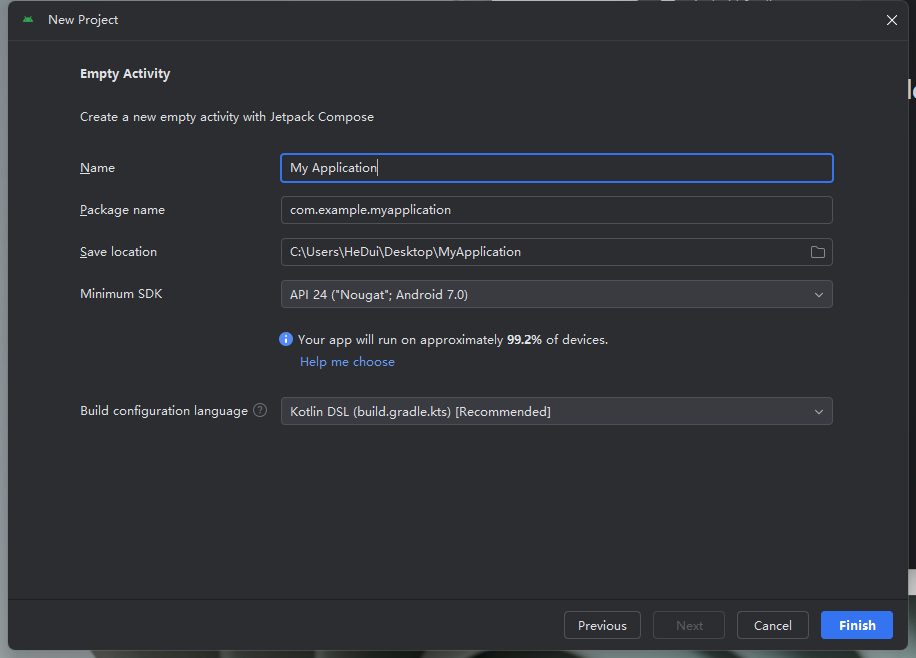 默认选项是:Kotlin DSL,还有一个是Groovy DSL选项,对于新项目,优先选择 Kotlin DSL,因其与现代 Android 开发(如 Jetpack Compose)整合更好,且 Google 官方主推;旧项目或依赖特定插件时,可暂留 Groovy DSL 以降低迁移成本。团队熟悉 Kotlin 时,Kotlin DSL 的长期维护性更优;小型项目或快速原型开发中,两者差异不明显。选择默认的即可。