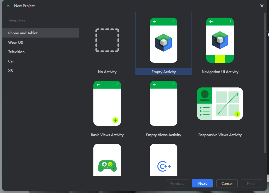 1.点击 New Project 选择 Empty Activity 然后点击 next 按钮创建一个空的程序。
