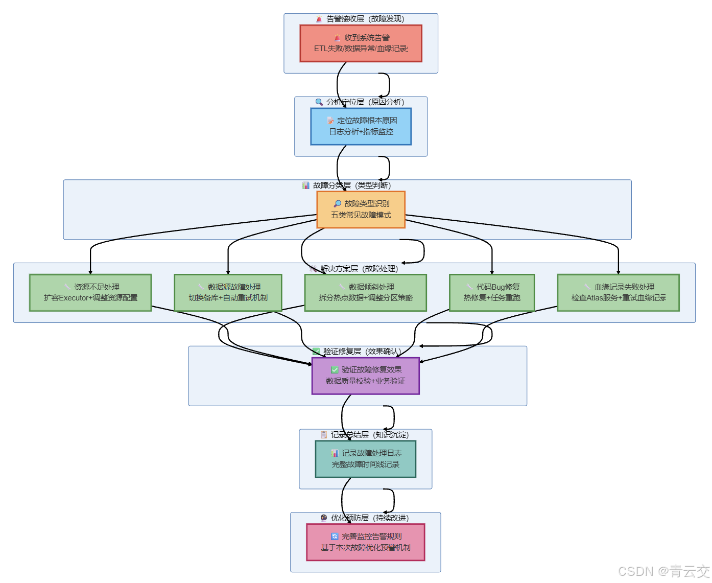 | 血缘追踪失败 | Atlas 客户端连接超时,血缘记录失败 | 1. 增加 Atlas 连接超时重试(3 次)2. 血缘记录失败降级为日志记录3. 监控 Atlas 服务状态,异常时告警 | 血缘记录成功率从 90% 提升至 99.5% |