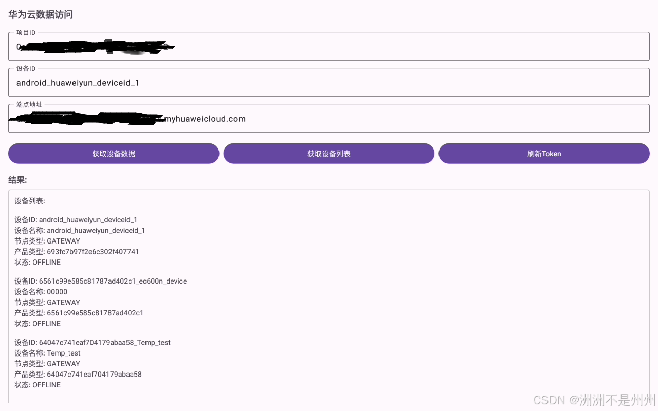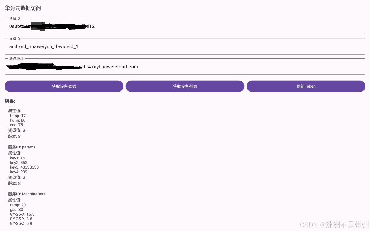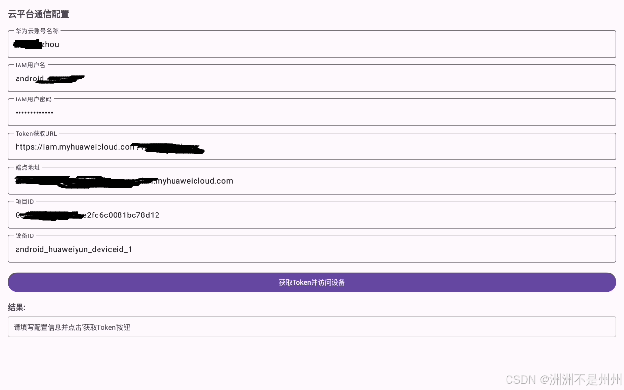 首先需要 获取Token---获取影子设备,进行连接。在本次博主做的APK中将需要连接的华为云的参数单独用文本框的形式写出,可以直接在界面填入自己云端的参数,这样就可以不用二次开发,拿来就能直接使用。