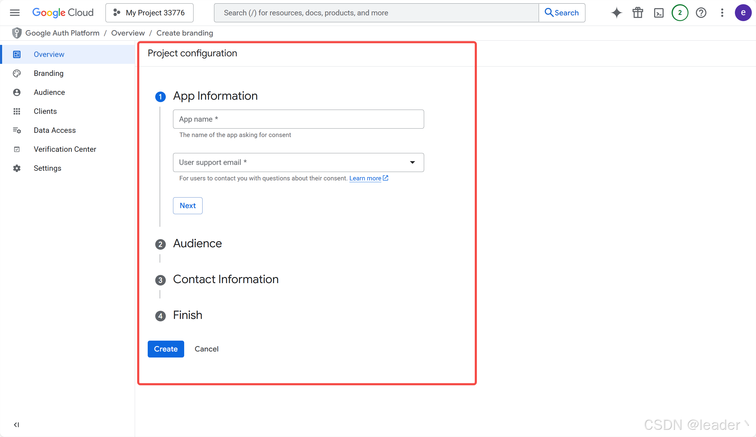 3. App Information可随意填写 ➡ Audience选择External(外部) ➡ Contact Information填写联系邮箱 ➡ Finish ➡ createe
