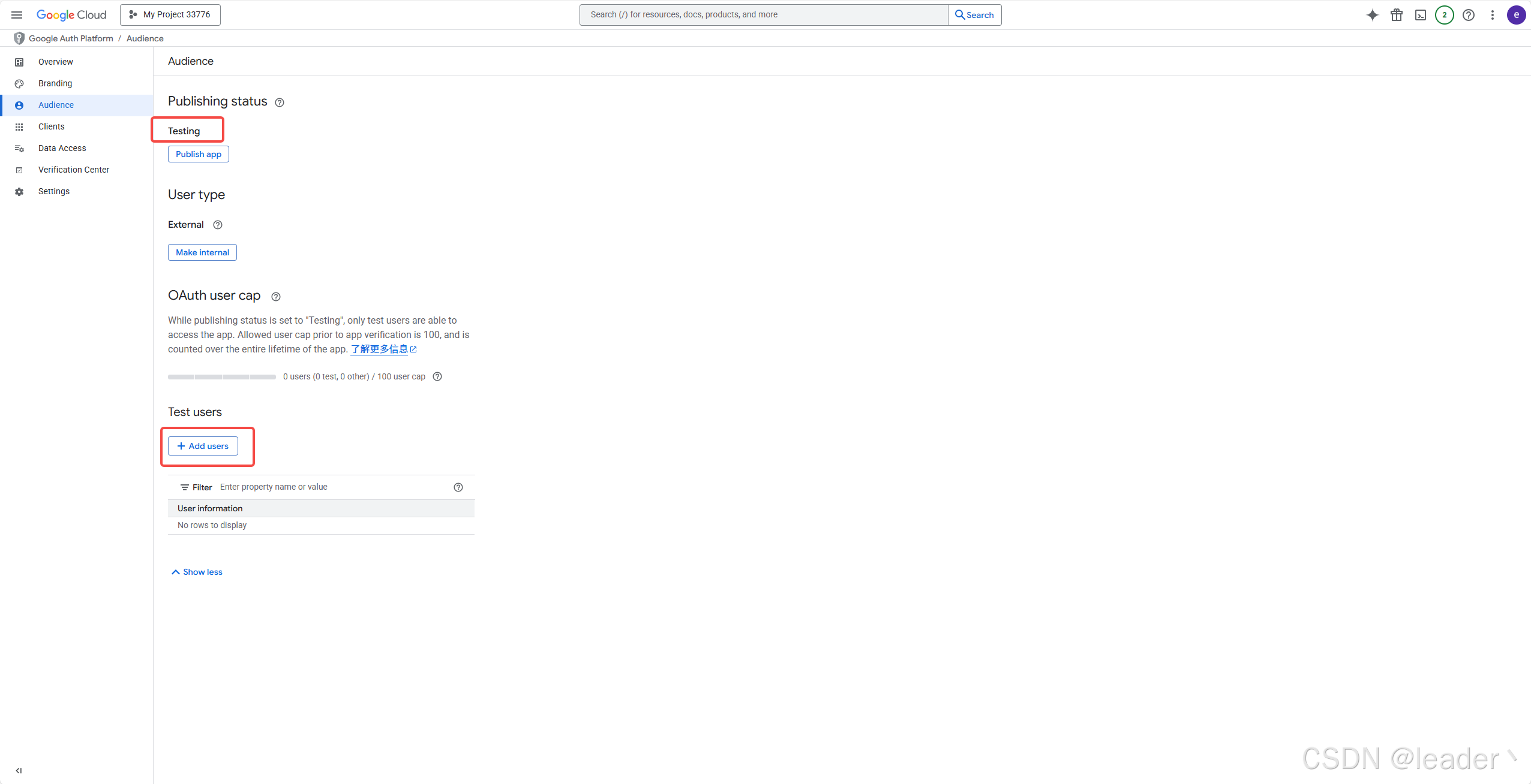 4.Audience ➡ 注意是否是测试阶段,下方Test users可以新增测试Google登录的测试账号;如果状态为已发布不是测试阶段,则不需要新增Test users