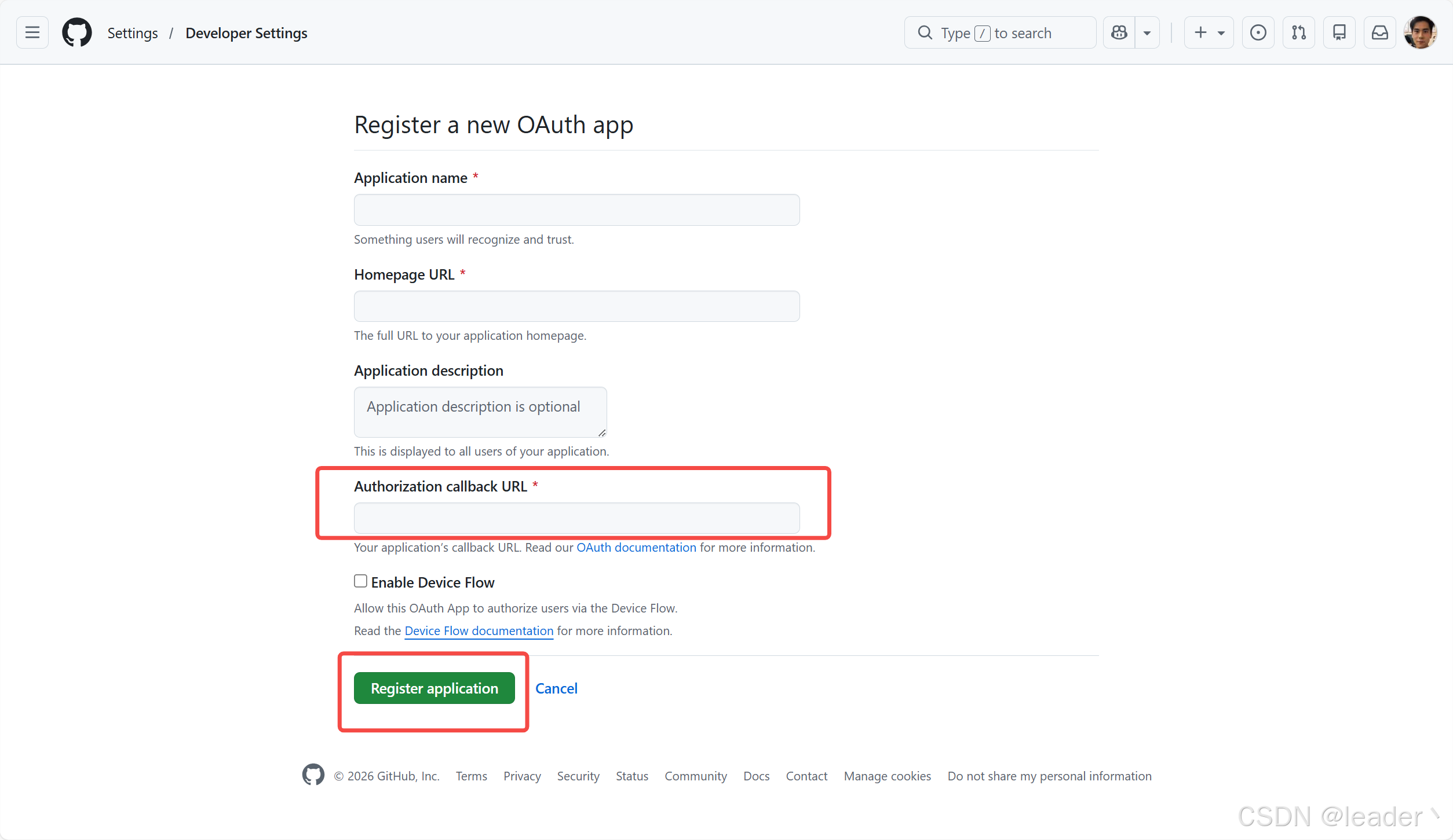Authorization callback URL为流程图中第七步第三方code和state返回的路径,后续前端用于获取系统服务端token