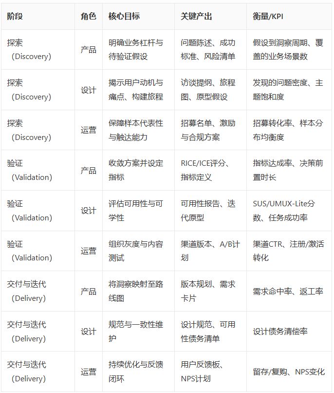 在研究的不同阶段,角色重心会变化。**探索期(发现问题)需要运营提供人群与场景线索,设计主导质性方法;验证期(比选方案)强调可用性测试与轻量实验,产品负责定义成功指标;交付期(上线与迭代)运营负责落地触达策略,并对变量进行市场端的A/B测试。**这种阶段性分工避免了"单点过载",也给予每个角色最擅长的环节以充分的舞台,形成专业分工与信息共享的动态平衡。