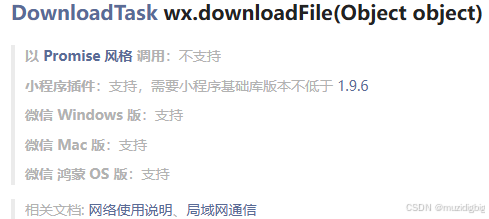 - wx.downloadFile() 小程序提供的 API,用于从网络上下载文件资源到本地。它通过发起一个 HTTPS GET 请求来获取文件,并返回文件的本地临时路径。