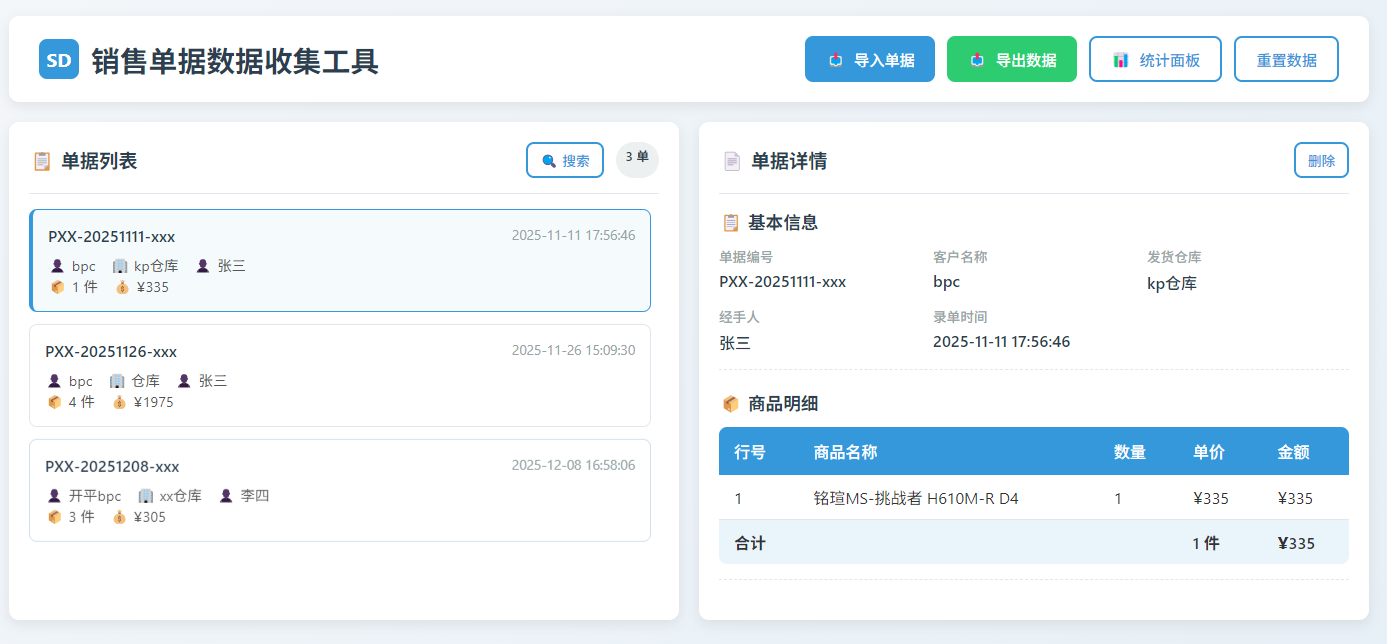 本工具是一个专门用于收集、管理和分析销售单据数据的Web应用程序。支持数据导入、搜索、统计分析和导出功能。