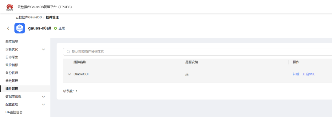 通过云数据库 GaussDB 管理平台(TPOPS)上传并安装插件,全程无需 SSH 登录服务器,操作流程如下: