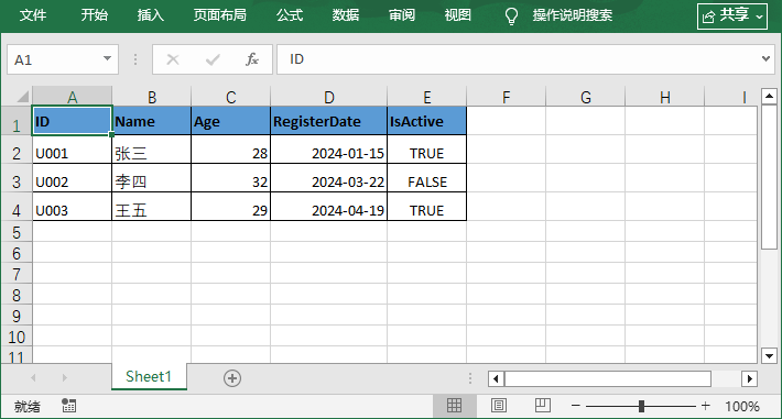 目标:读取该 Excel 数据,转换为结构化 JSON,保留数据类型一致性。