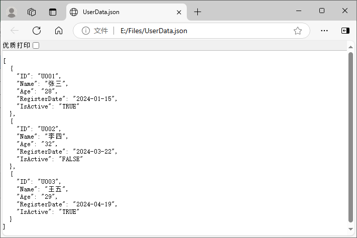 生成的 UserData.json 文件内容如下,数据类型与 Excel 保持一致: