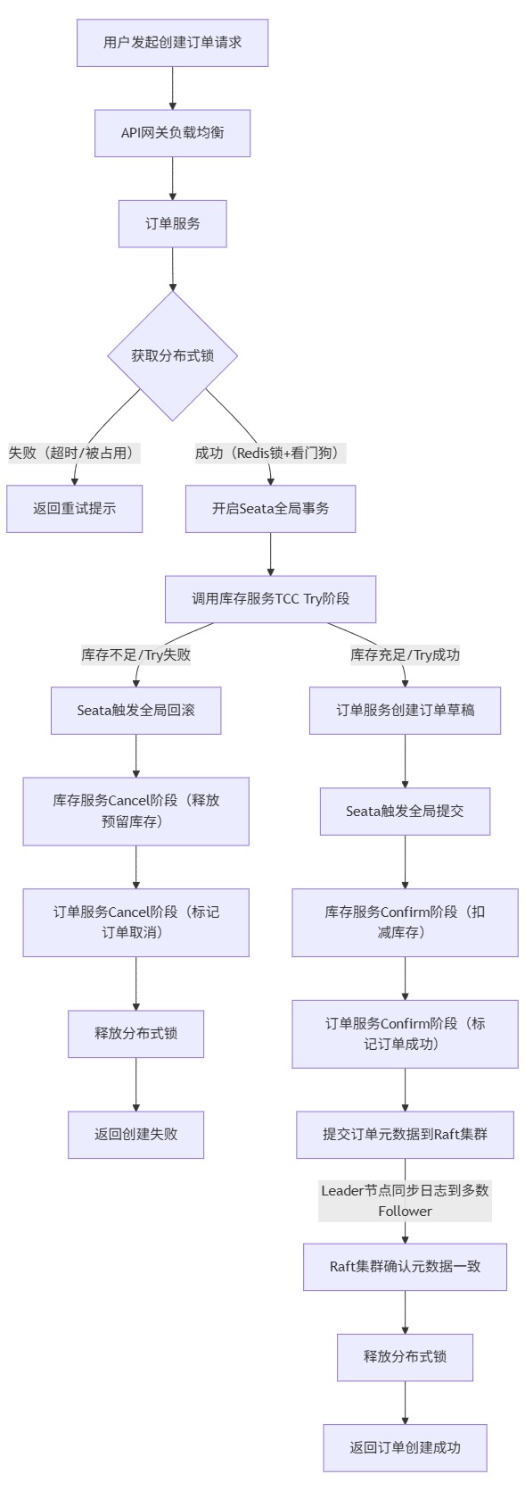 以下通过Mermaid流程图,展示用户创建订单请求从入口到分布式锁获取、事务执行、一致性状态同步的完整流程,整合分布式锁、Seata TCC事务、Raft集群三大技术。