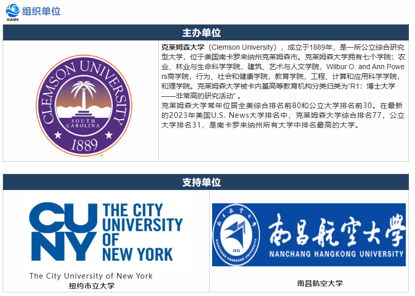 - 主办单位:克莱姆森大学(Clemson University,美国公立综合研究型大学,U.S. News全美综合排名77)