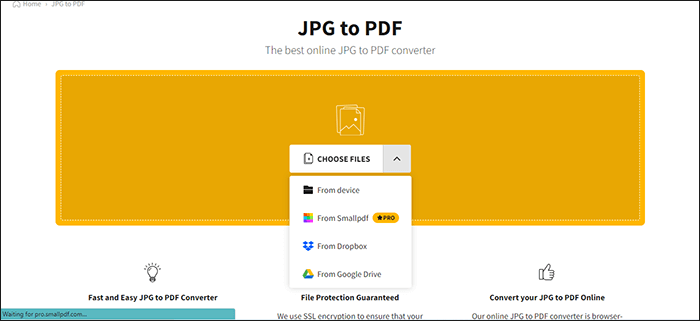 步骤 1. 转到 Smallpdf 网站并单击"选择文件"或将 JPG 拖放到此处。