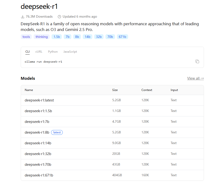 ollama里面已经写好了各种命令,可以帮助你直接安装各种模型,不过一般自己电脑配置不行,就只能安装deepseek-r1 1.5b...不过这个模型是真的拉。部署完以后,就可以直接访问自己部署的模型了,不在需要apikey了