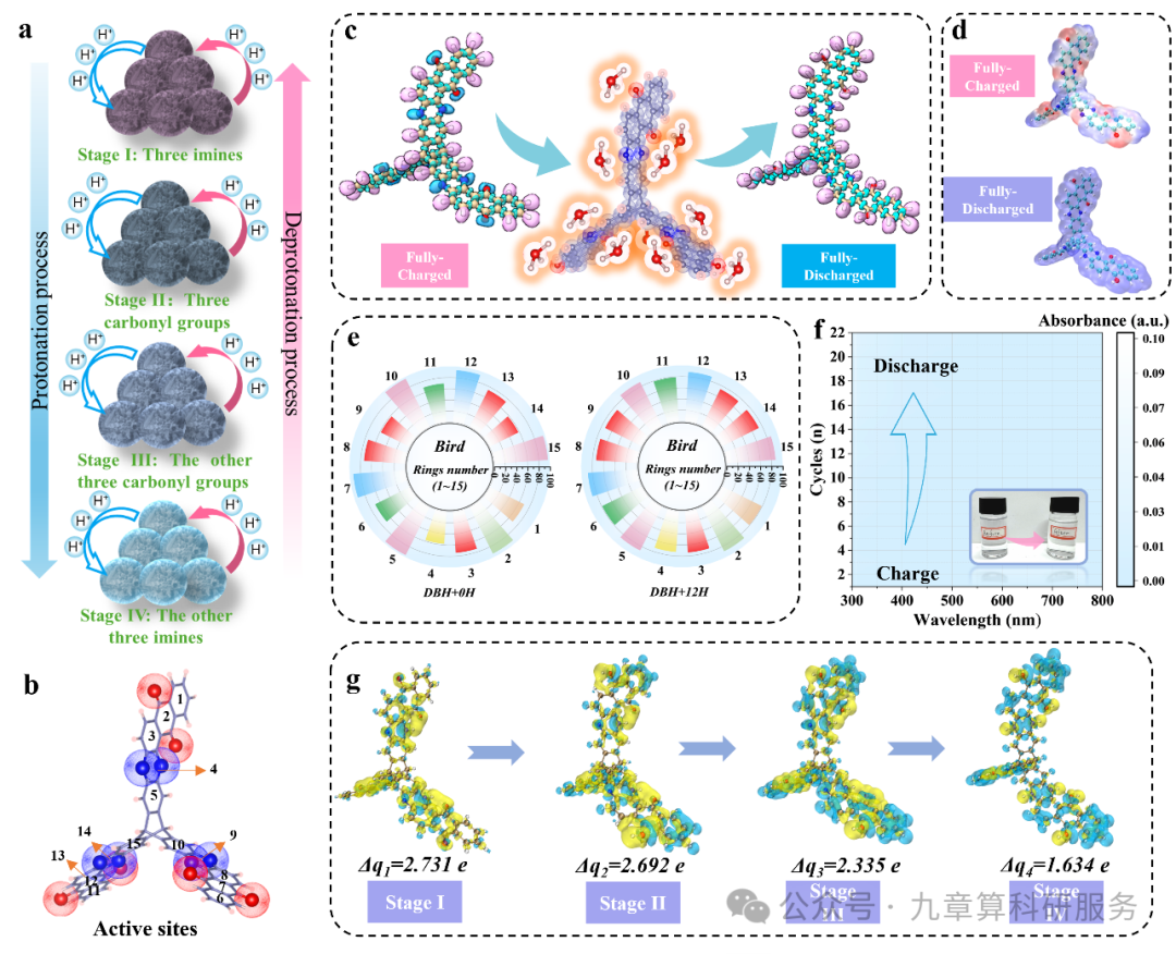 图 4. DBH 分子的质子化机理及电子结构演化。(a)发生于亚胺与羰基位点的四步连续质子化路径;(b)DBH 框架中十二个氧化还原活性位点的空间分布及十五个苯环的编号示意;(c)在完全充电态与完全放电态下的电子定域函数(ELF)分布;(d)本征态与完全质子化状态下 DBH 的分子静电势(MESP)分布图;(e)充放电状态下分环分辨的 Bird 芳香性指数;(f)充放电循环过程中采集的原位紫外--可见吸收光谱;(g)DBH 在四个质子化阶段的差分电荷密度等值面。