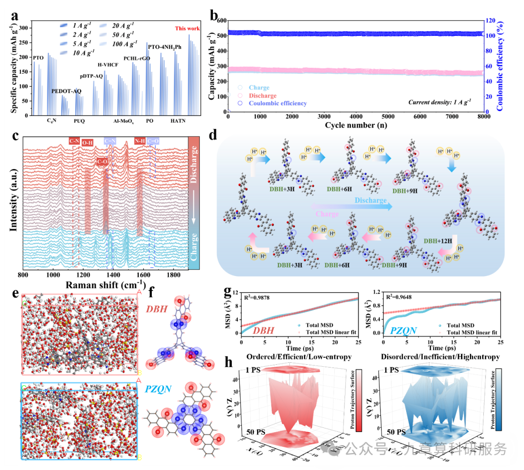 图 3. DBH 电极的电化学质子存储性能。(a)在不同电流密度下,DBH 电极与已报道有机质子存储电极比容量的对比;(b)在 1 A g−1 电流密度下的长循环性能;(c)电化学过程中采集的原位拉曼光谱;(d)基于 DFT 计算提出的质子化反应路径;(e)分子动力学模拟得到的 DBH 与 PZQN 中质子迁移环境快照;(f)DBH 分子及其具有匹配氧化还原活性位点密度的 PZQN 分子;(g)DBH 与 PZQN 中质子的均方位移(MSD)演化;(h)DBH 与 PZQN 的三维质子轨迹表面。