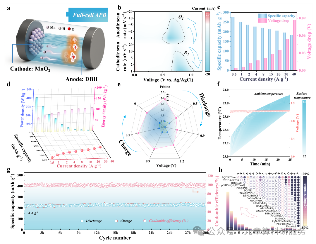 图 5. DBH//MnO2 水系质子电池(APB)全电池性能验证。(a)DBH//MnO2 全电池器件的结构示意图;(b)不同扫描速率下循环伏安(CV)曲线的等高线图;(c)在不同电流密度下,全电池的比容量及对应的电压降;(d)在不同电流密度下,APB 器件的比容量、能量密度与功率密度;(e)基于 DRT 分析得到的 Ragone 图,展示充放电过程中弛豫时间分布及其随电位变化的迁移行为;(f)穿刺测试过程中器件表面温度与电压的同步监测结果;(g)在 4 A g−1 电流密度下,全电池 APB 器件超过 30,000 次循环的长期循环稳定性及库仑效率;(h)与已报道 APB 器件的长期循环保持率对比。