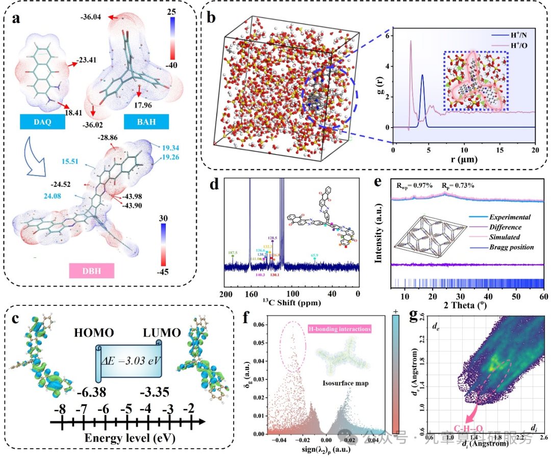 图 2. 结构表征。(a)DAQ 与 BAH 前驱体及 DBH 分子的分子静电势(MESP)分布图;(b)基于分子动力学模拟得到的 DBH 与质子之间的径向分布函数(RDF);(c)前线分子轨道的计算分析结果;(d)13C 核磁共振谱图;(e)粉末 X 射线衍射(PXRD)图谱及晶体结构分析;(f)独立梯度模型(IGM)分析结果;(g)由 Hirshfeld 表面分析得到的对应指纹图。