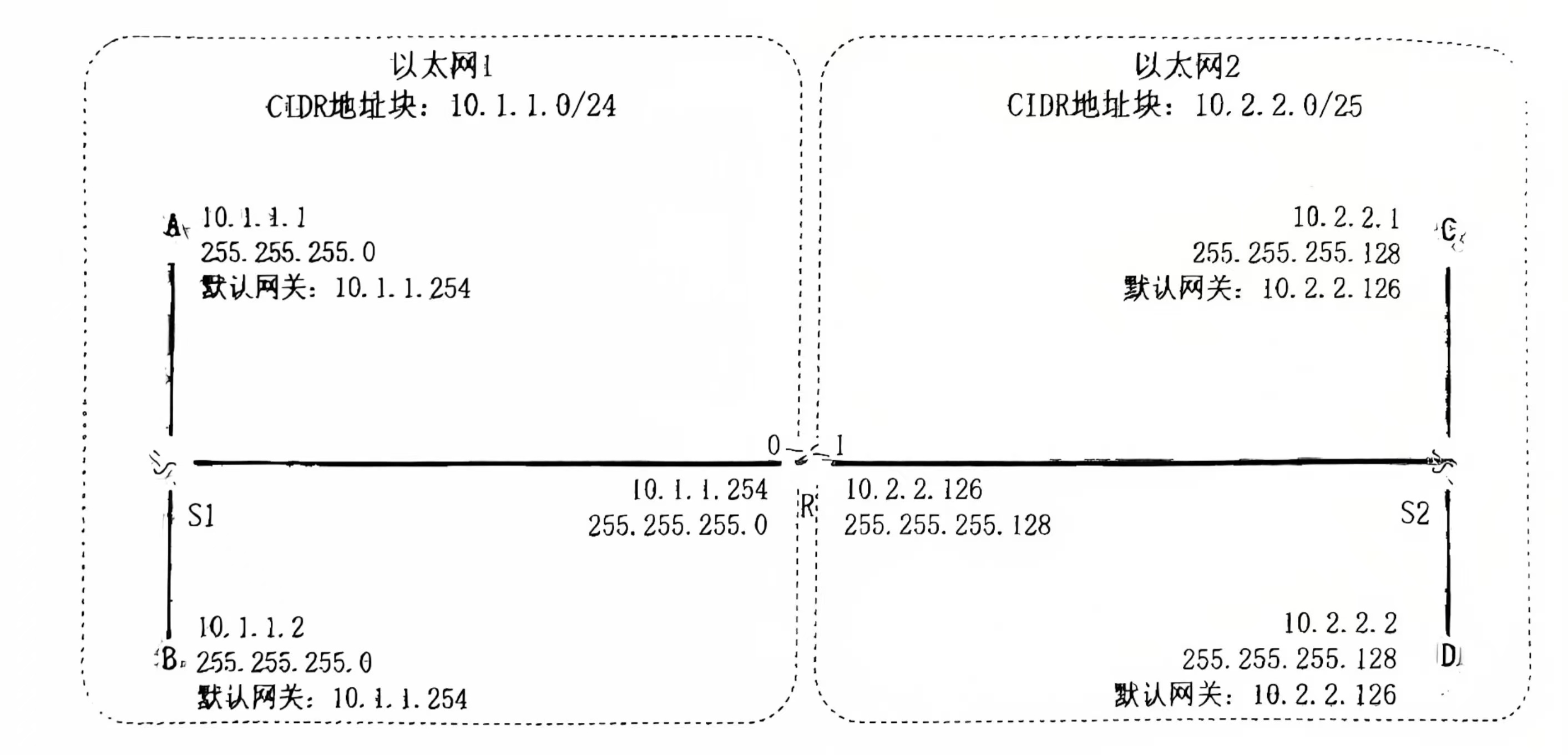 以太网2([10.2.2.0/25](10.2.2.0/25))主机的默认网关:路由器R的接口1(
