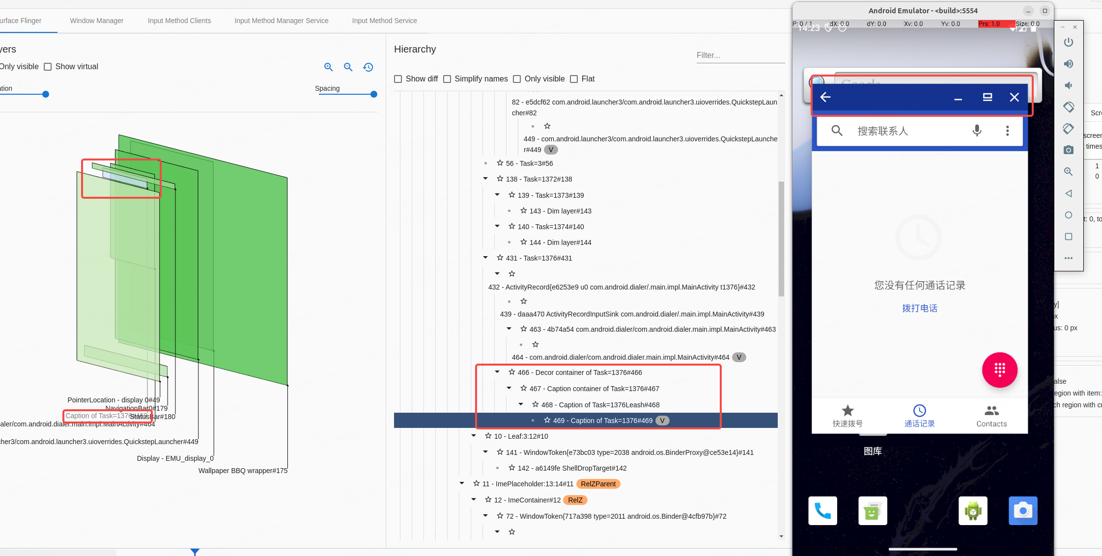 本地通过dump activity containers,View树以及window等方式均未找到自由窗口状态栏相关代码,最终通过winscope dumpsys SF找到相关线索。