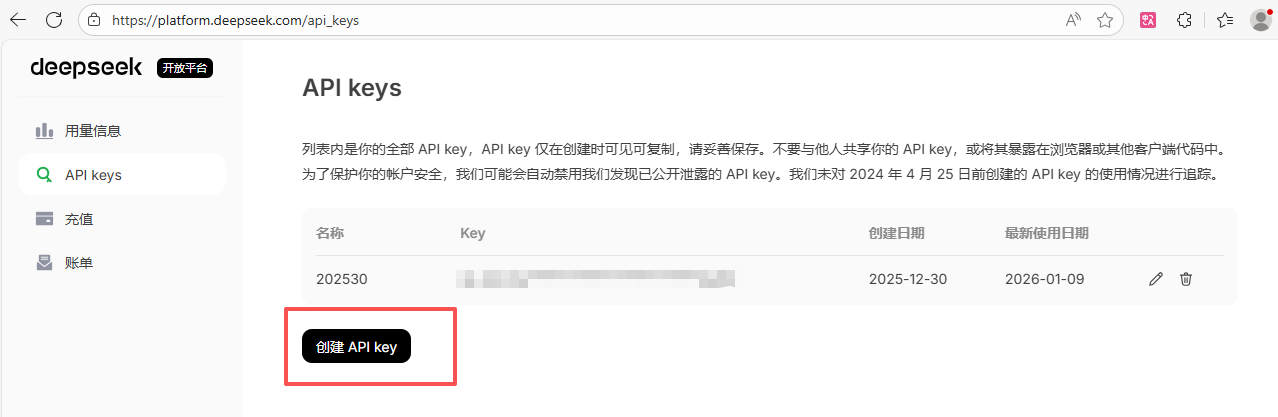 选择API平台,手机号、验证码登录成功,创建自己的API key 注意保存,不要泄密。