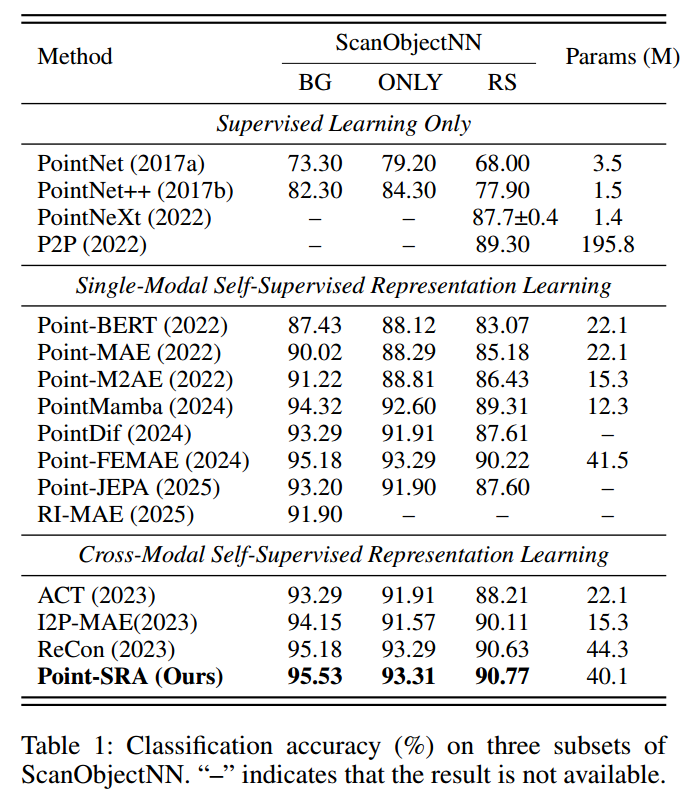 在真实世界物体分类基准数据集ScanObjectNN(Uy等人,2019)上评估预训练模型:该数据集包含15个类别共1.5万个点云物体,分为三个子集------OBJ_BG(含背景的物体)、OBJ_ONLY(仅物体)、PB_T50_RS(含背景与人为扰动的物体)。