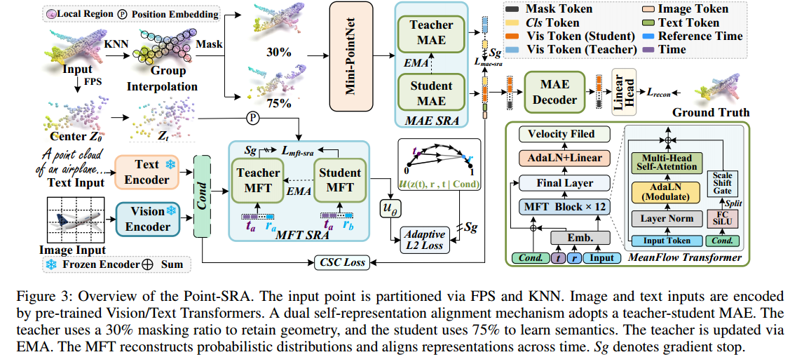为解决这些问题,我们提出一种3D表征学习方法Point-SRA ,通过自蒸馏与概率建模实现表征对齐。具体而言:我们为MAE分配不同掩码率,以捕捉互补的几何与语义信息;同时,MeanFlow Transformer(MFT) 利用跨模态条件嵌入,实现多样化的概率重建。