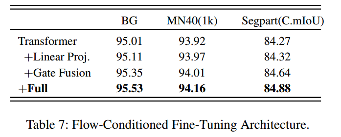 表7展示了流条件微调增强对下游性能的具体影响:首先通过流条件投影层,将预训练MFT的几何分布转换到特征对齐空间;随后引入可学习的门控融合机制,自适应控制融合强度,让网络动态利用预训练知识。