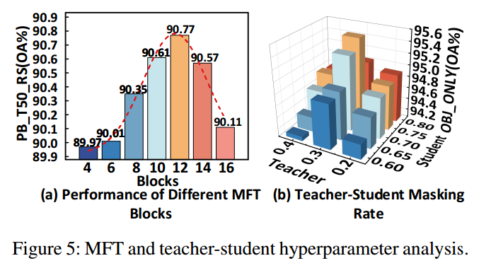 图5(b)展示了不同掩码率设置对性能的影响:最优配置为教师模型采用30%掩码率、学生模型采用75%掩码率,以此取得最佳结果。